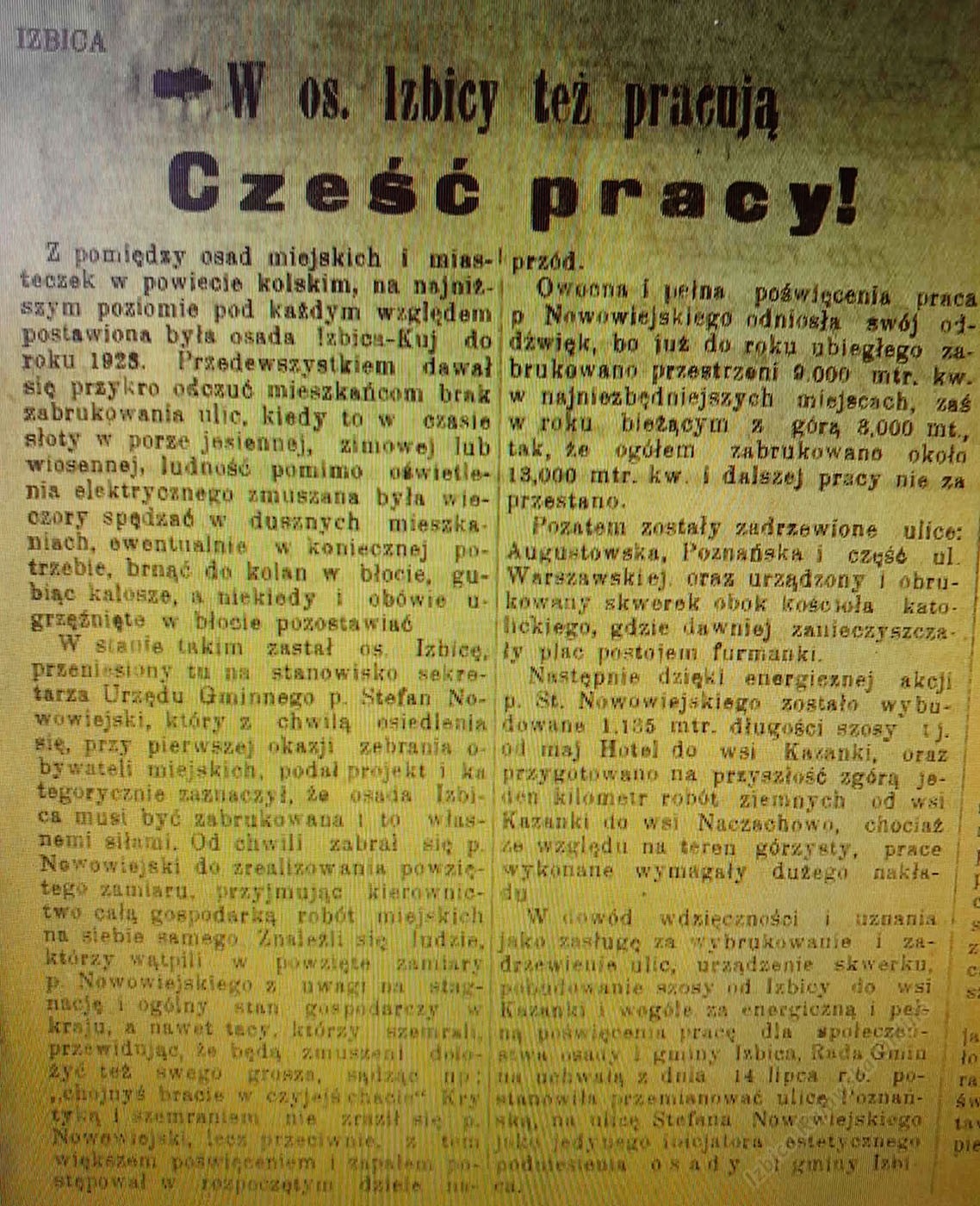 Punktem wyjścia była uchwała Rady Gminnej z dnia 14 lipca 1933 roku na mocy której dotychczasowa ulica Poznańska miała otrzymać imię wspomnianego urzędnika. Pierwszy artykuł jest niemalże laurką na cześć Nowowiejskiego, ponieważ przedstawia go jako jedynego sprawcę zmian, który od razu po przyjeździe zaczął walczyć z zacofaniem Izbicy. Autor tekstu w gazecie obrazowo opisał, jak przed 1928 rokiem mieszkańcy brodzili w błocie po kolana, a wybrukowanie 13 tysięcy metrów kwadratów ulic uznał za klucz do poprawy wyglądu i higieny osady.