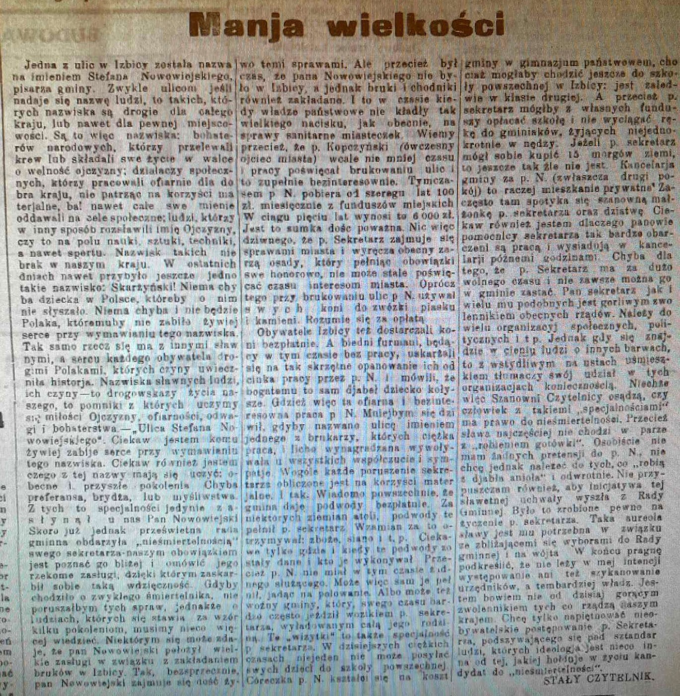Wkrótce potem na łamach tego samego tytułu ukazał się głos polemiczny pt. "Manja wielkości", będący przykładem dość bezkompromisowej krytyki prasowej. Autor podpisany jako "Stały Czytelnik" podważył wizerunek sekretarza jako działającego bezinteresownie społecznika. Zakwestionował on moralność nazywania ulicy imieniem urzędnika i postawił mu konkretne zarzuty finansowe oraz służbowe, a były nimi w szczególności: pobieranie stałego wynagrodzenia (100 zł miesięcznie) z funduszów miejskich za nadzór nad robotami, co podważało tezę o bezinteresowności czynu, wykorzystywanie prywatnego inwentarza do odpłatnej zwózki materiałów budowlanych oraz wykorzystywanie pozycji urzędniczej do zabezpieczania osobistych interesów rodziny.