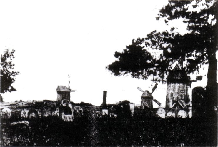 | Wiatraki i cmentarz żydowski w okresie międzywojennym [źródło: Hederych J., Izbica Kujawska w XX w., [w:] Zapiski kujawsko - dobrzyńskie, t. 12: miasta Kujaw i ziemi dobrzyńskiej w XX wieku, Włocławek 1998.] |